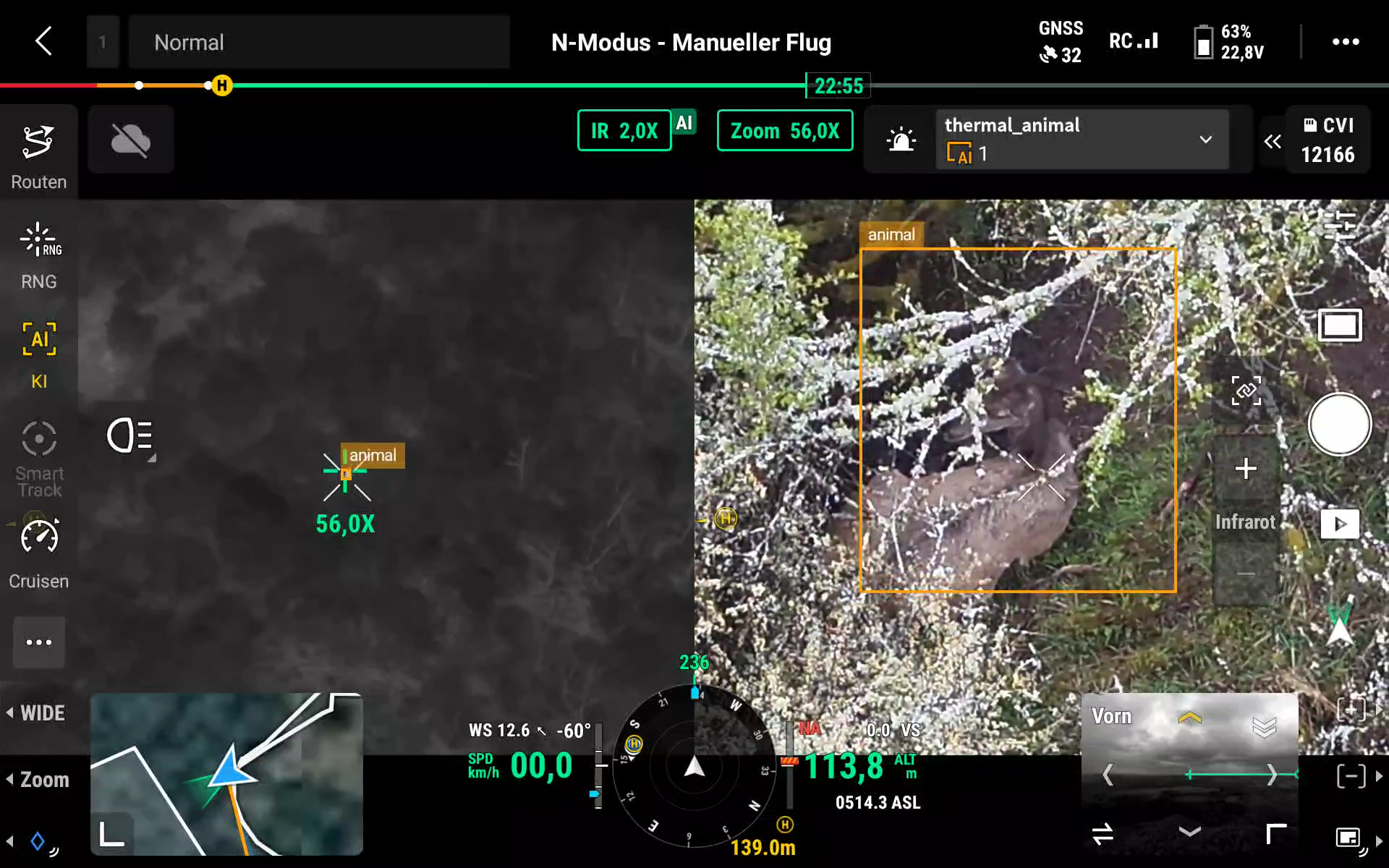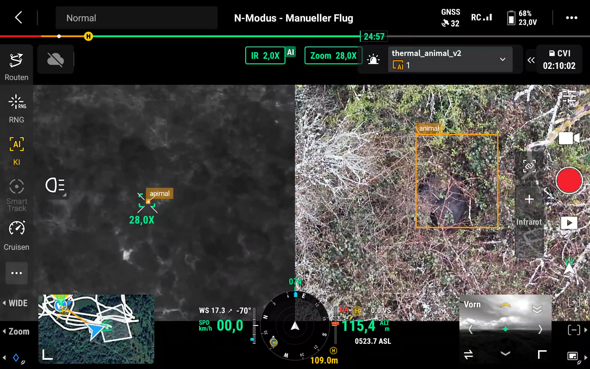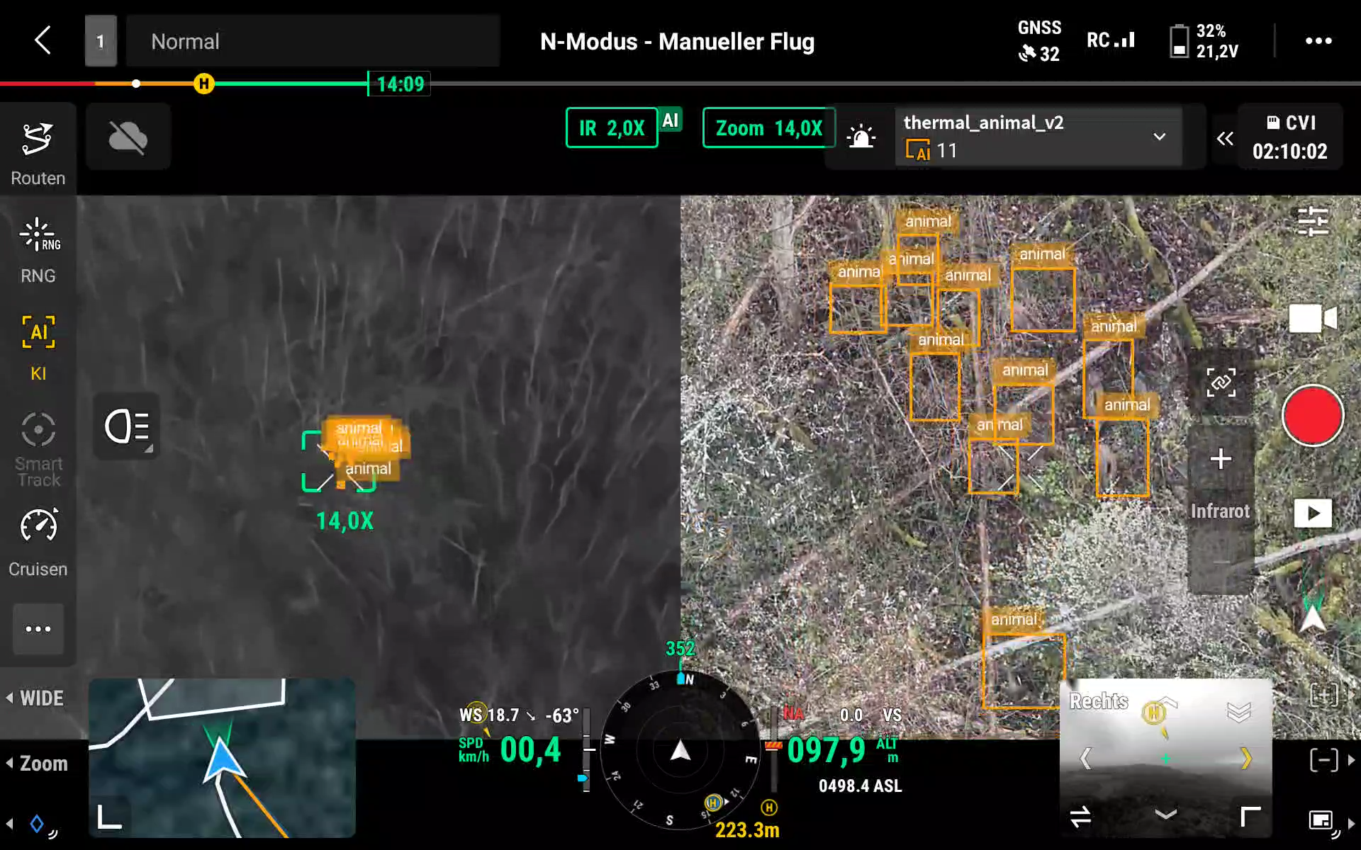 Gerade bei der Kitzrettung oder beim Wildmonitoring zählt jede Sekunde. Die KI analysiert kontinuierlich das Kamerabild deiner Drohne und markiert erkannte Tiere direkt im Bild. Dadurch werden Suchflüge deutlich effizienter, Fehlinterpretationen reduziert und auch schwer erkennbare Tiere zuverlässig identifiziert. Neben der Erkennung wird auch die Anzahl der Tiere angezeigt!